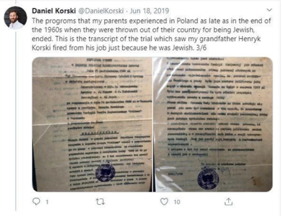 Daniel Korski himself eventually headed to Twitter to show people the evidence that his parents were Jewish refugees fleeing persecution. He posted two images of official court documents sealed in plastic sleeves and describe it as evidence of a pogrom. For those who are unaware, a pogrom is described as “an organized massacre, especially of Jews”. But do the documents supplied by Daniel Korski provide any evidence of a massacre of Jewish people? The straight answer is a definite no. The court papers Korski so proudly presents on Twitter do not mention Judaism at all, but they do mention Henryk Korski’s stance on the war between Israel and Egypt. The documents, which were written in Polish, relate to a court case involving Henryk Korski and his employer.