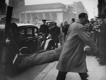 “A long queue waited to enter the court. There were many men in long heavy overcoats and black Homburg hats, and crowds of young girls. Costermongers and Covent Garden porters streamed across the road to the court building. Traffic was held up. The Burnley football team, in town for their match with Charlton, were in court. Claret and blue rosettes of Burnley supporters sprinkled the queue.”