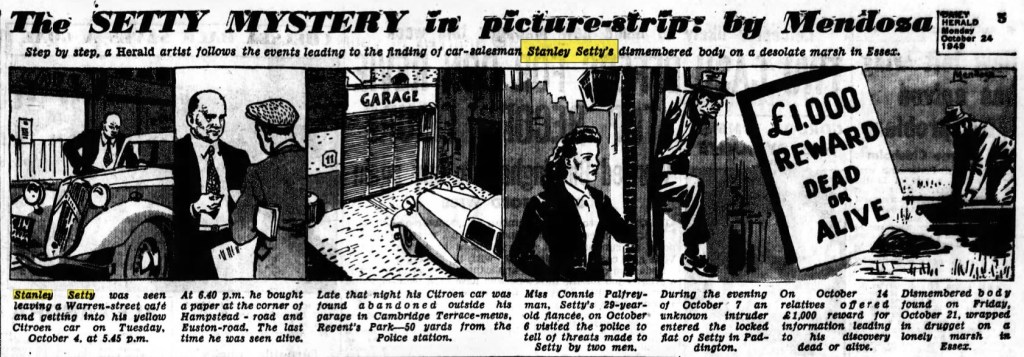 It was Tuesday, 4 October 1949, Stanley Setty, a well known car dealer on the Warren Street motor market, prepared to complete a car deal where around £1,500 was to be exchanged. By 5:45pm the same day, he was seen sitting in his own car while his assistant had gone to the bank to cash a £1000 check for him that was from the sale of a Wolseley automobile. At 6:40pm that evening, Setty bought a newspaper at the corner of Hampstead Road and Euston Road and later that evening, Stanley Setty’s car was seen sitting outside his garage in Chester Place, and was still parked there in the morning. However, Setty himself had vanished.