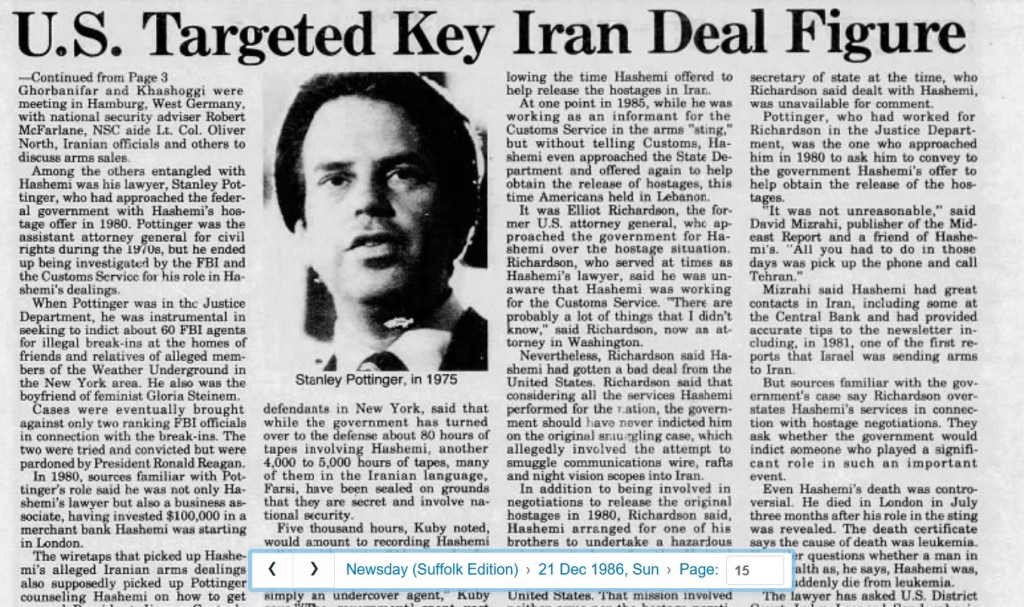 “When Pottinger was in the Justice Department, he was instrumental in seeking to indict about 60 FBI agents for illegal break-ins at the homes of friends and relatives of alleged members of the Weather Underground in the New York area. He also was the boyfriend of feminist Gloria Steinem. Cases were eventually brought against only two ranking FBI officials in connection with the break-ins. The two were tried and convicted but were pardoned by President Ronald Reagan. In 1980, sources familiar with Pottinger’s role said he was not only Hashemi’s lawyer but also a business associate, having invested $100,000 in a merchant bank Hashemi was starting in London.”