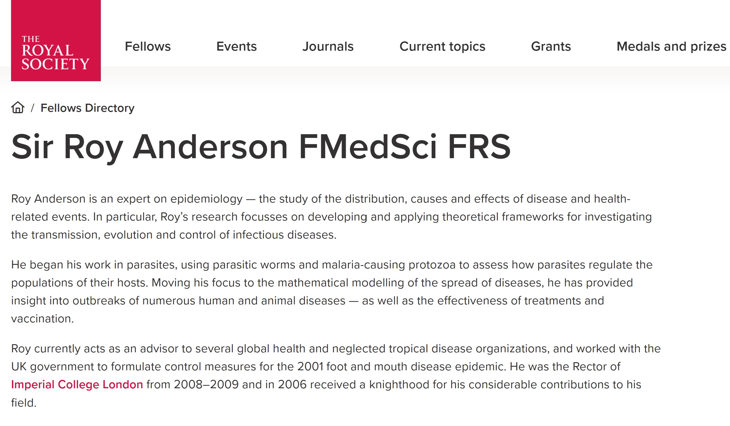Sir Roy Malcolm Anderson is a British professor of epidemiology and is the link that connects many of Britain’s major modern pandemic responses and many of the official cover-ups related to those events. He also happens to be the pioneer of pandemic computer modelling, models which, when applied to real-world situations, have often been proven highly erroneous. Nevertheless, his importance to and influence on the events of the last quarter of a century cannot be understated. Sir Roy Anderson is the British Establishment’s “man for all seasons” when it comes to pandemics.