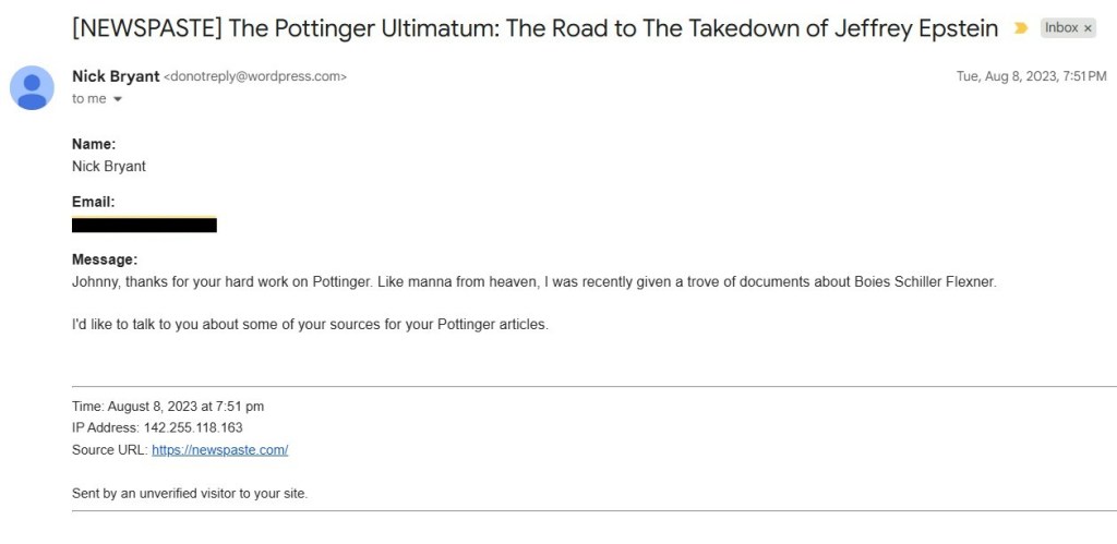 After I published my Pottinger articles, Nick Bryant, the author of The Franklin Scandal, contacted me via email to say he had important information about Stanley Pottinger. Again, I had never spoken to Bryant and was unaware of his connections to the legal team, which included Pottinger. We eventually spoke via a Zoom call, and, to my dismay, Nick Bryant not only tried to sell me George Tonks but also tried to undermine my Pottinger series. Bryant originally contacted me, claiming that he had a “trove of documents about Boies Schiller Flexner.” However, when we spoke, he told me that Tonks had the documents. It was clear that Bryant was attempting to link me and my work with this convicted fraudster. Bryant’s efforts were brazen and, in the world of journalism, an unforgivable attempt to ruin someone’s reputation.