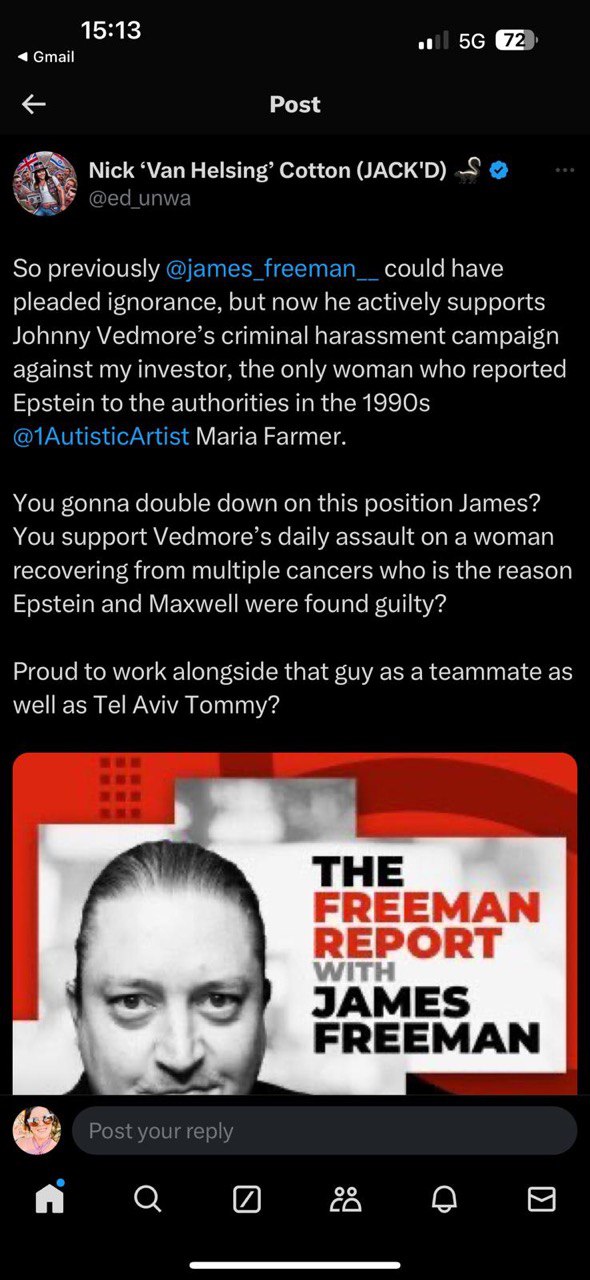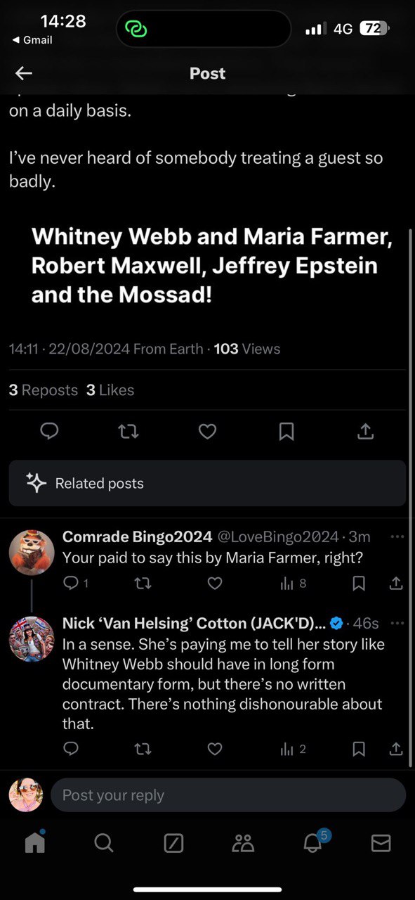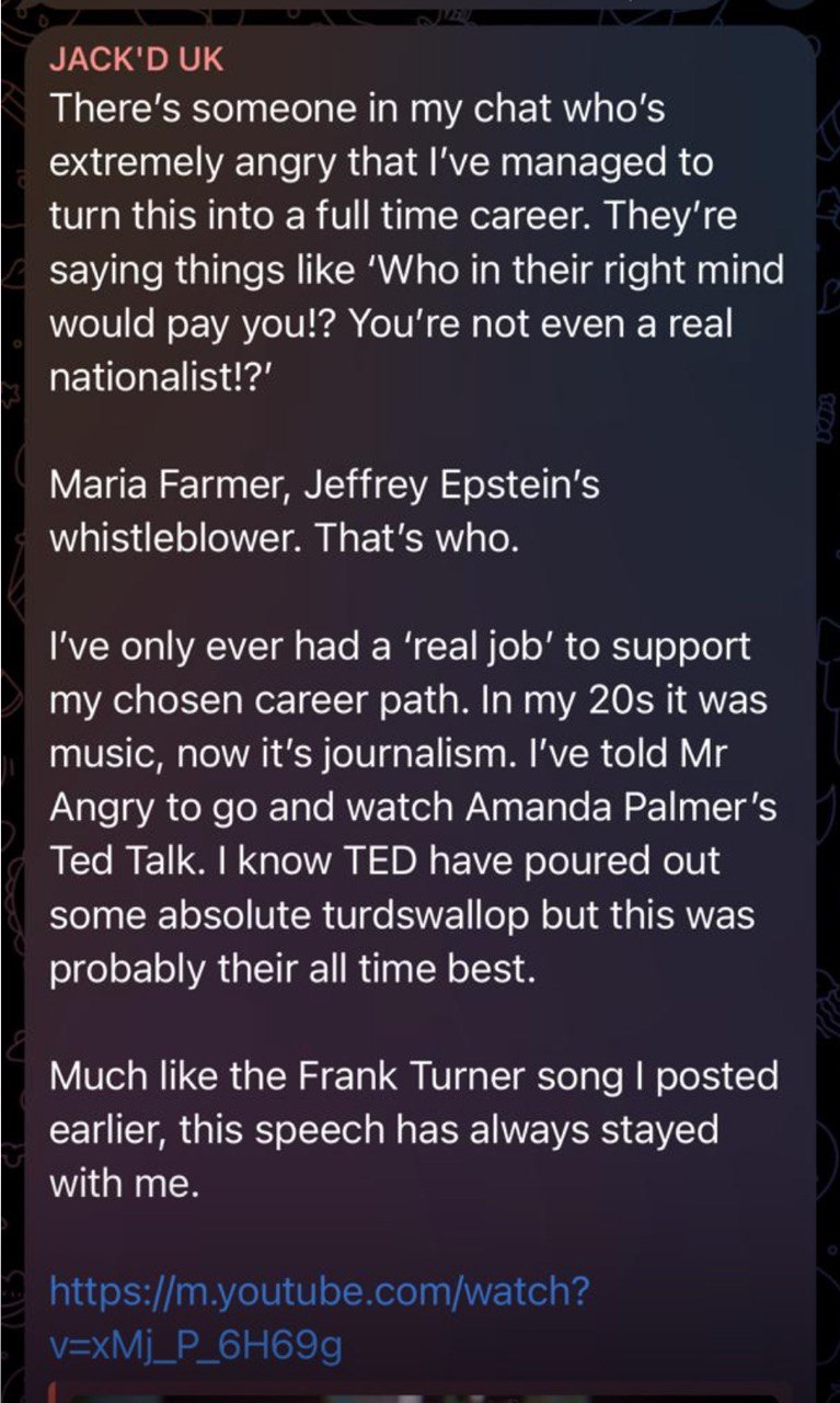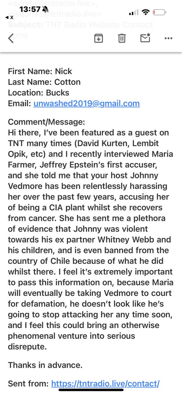 Maria Farmer also directly paid people to make false claims about me online. She paid a British independent journalist with links to my hometown, Nick Cotton, to claim that I had been arrested in Chile for assaulting my child, and that I had been found guilty in court and deported from the country. In reality, I have never been arrested, tried or deported for any crime in any country. He also used these false claims in an attempt to get me fired from presenting the Johnny Vedmore Show on TNT Radio. Cotton even stated publicly, “Jeffrey Epstein’s money is in my bank account right now.” Indeed, Maria Farmer was using the money she had made from the Epstein case while surreptitiously working for the legal team to employ people to harass and defame me. Essentially, Epstein’s funds were still being used to target and silence journalists. Since then, Nick Cotton has deleted all of his social media accounts, his entire platform, including his website, and has left independent media entirely.