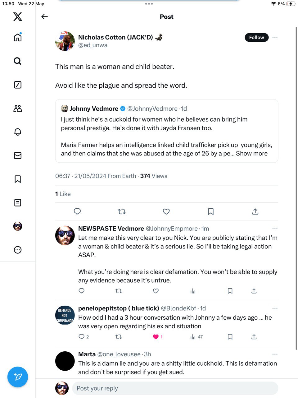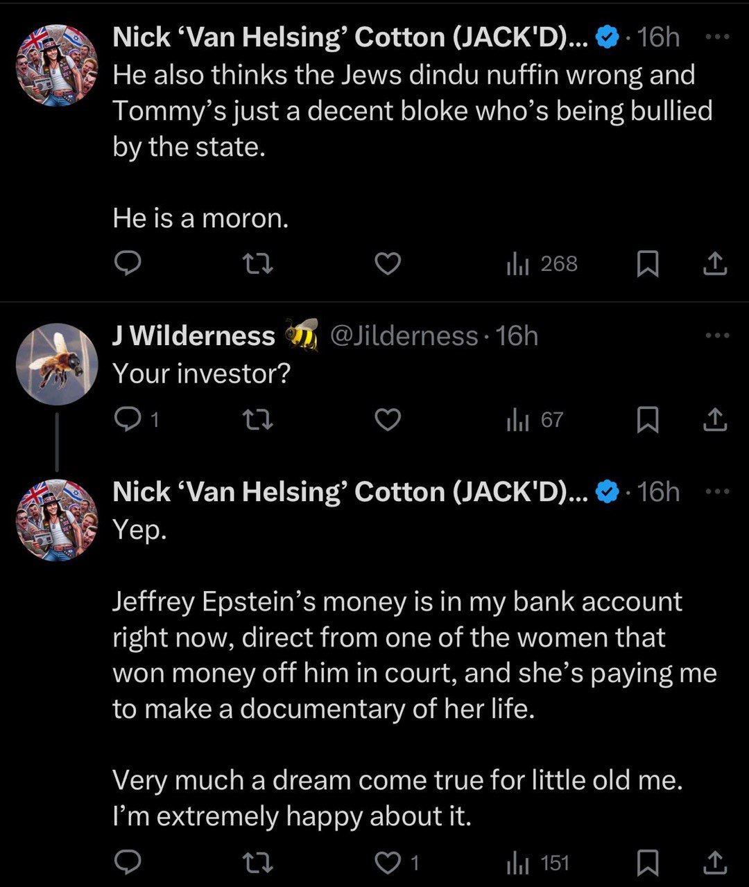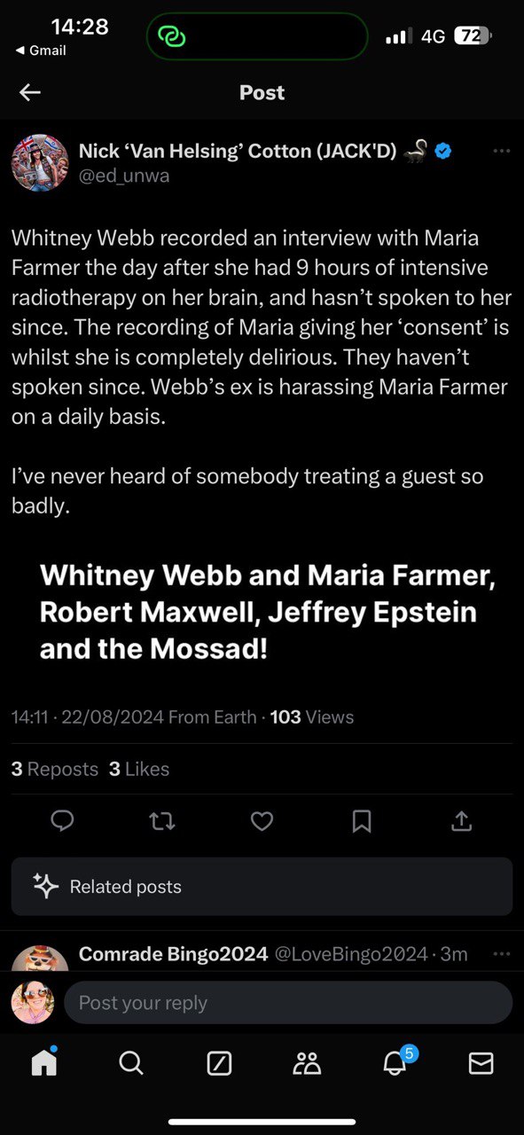 Maria Farmer also directly paid people to make false claims about me online. She paid a British independent journalist with links to my hometown, Nick Cotton, to claim that I had been arrested in Chile for assaulting my child, and that I had been found guilty in court and deported from the country. In reality, I have never been arrested, tried or deported for any crime in any country. He also used these false claims in an attempt to get me fired from presenting the Johnny Vedmore Show on TNT Radio. Cotton even stated publicly, “Jeffrey Epstein’s money is in my bank account right now.” Indeed, Maria Farmer was using the money she had made from the Epstein case while surreptitiously working for the legal team to employ people to harass and defame me. Essentially, Epstein’s funds were still being used to target and silence journalists. Since then, Nick Cotton has deleted all of his social media accounts, his entire platform, including his website, and has left independent media entirely.